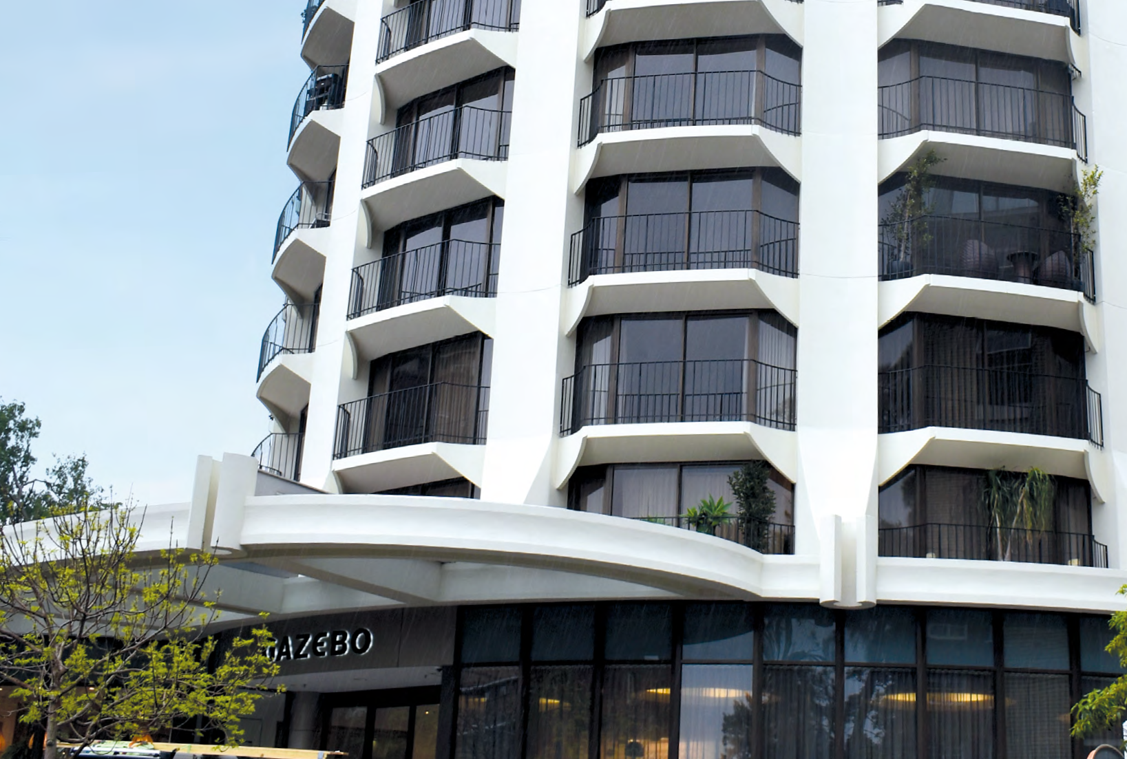 The Gazebo’s combination of curved columns and balconies, the decorative summit and the materials such as white marble aggregate finish and pre-cast panels gave the building its original aesthetic appeal.