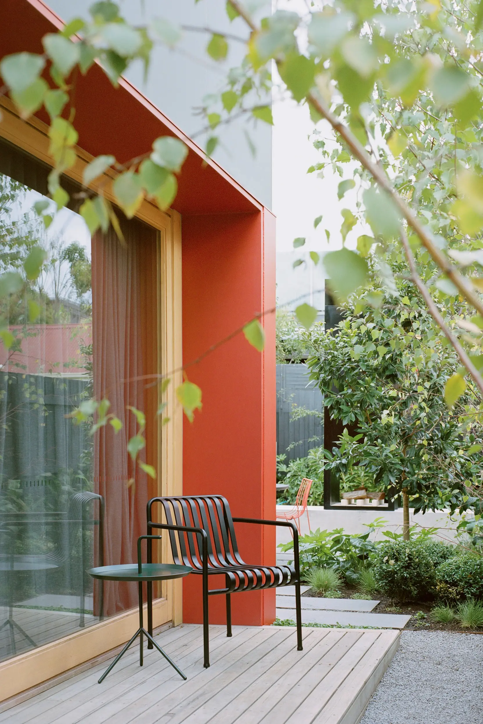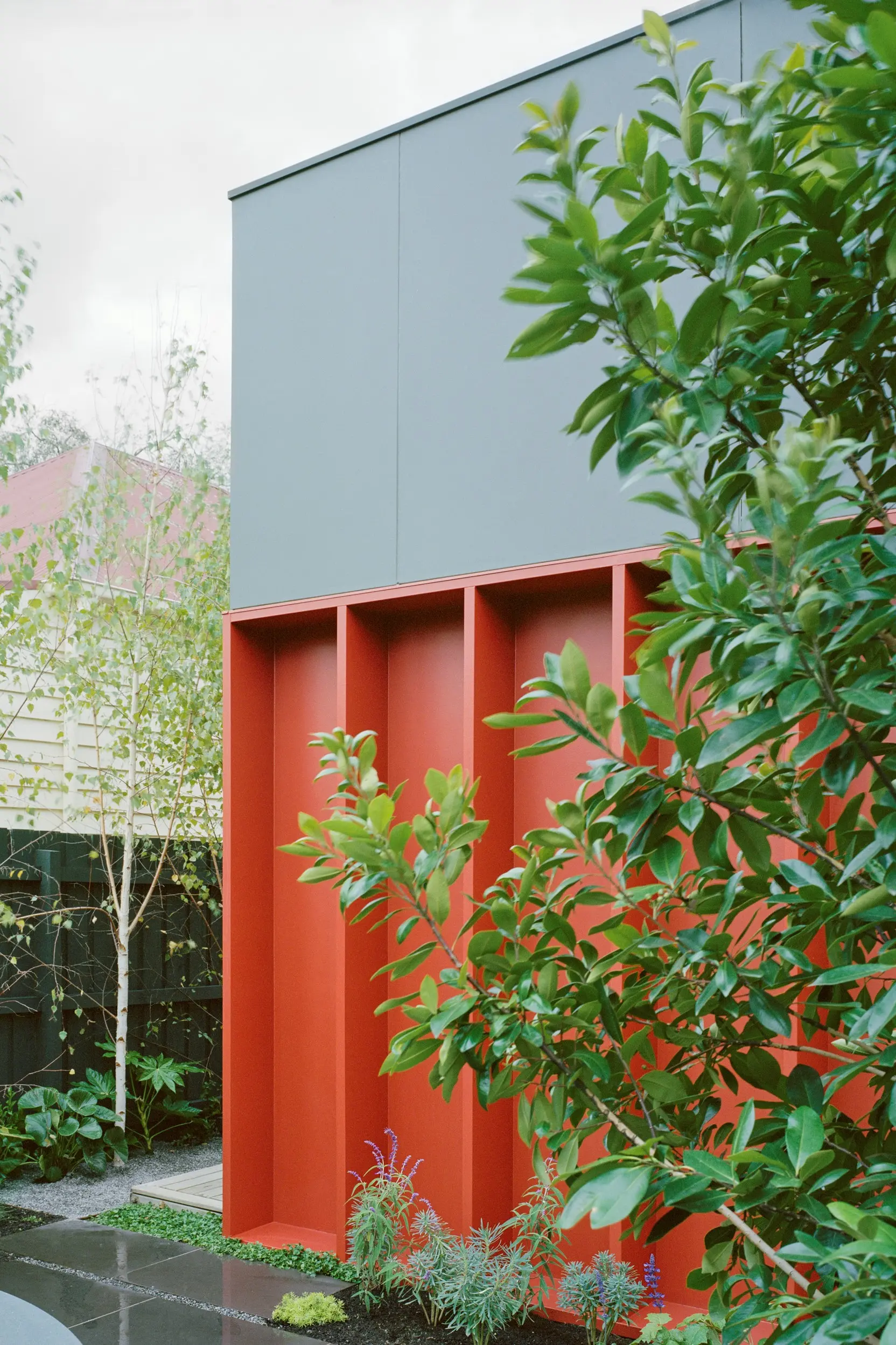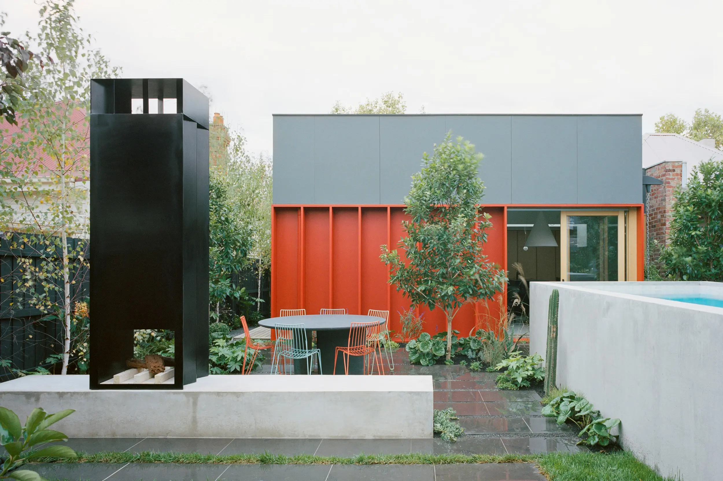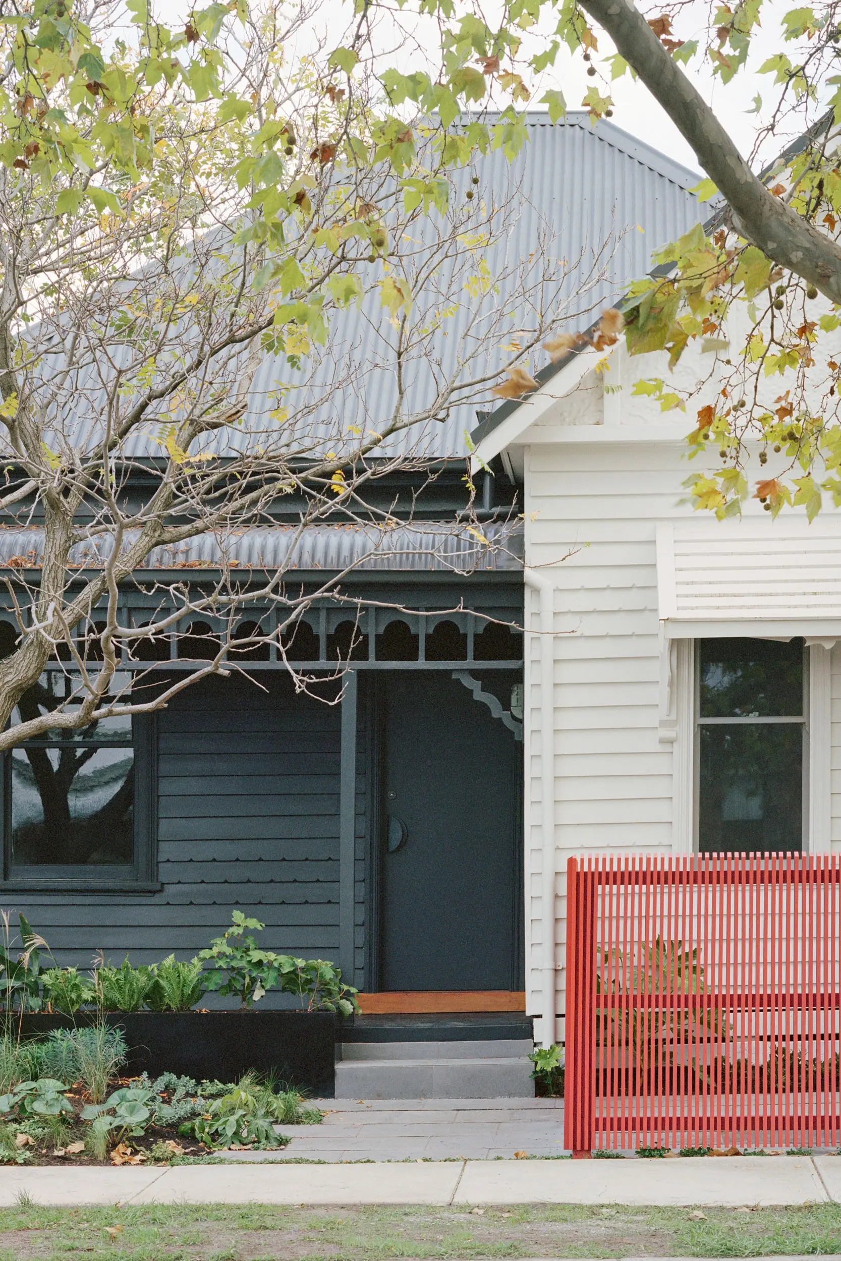 “Rejecting the often-used strategy of blending old and new in residential additions, this design not only opts for an obvious delineation, but a bold, forthright one, with colour as the primary mechanism. Using a combination of dark cladding and deep red door reveals and fins, the new addition is given depth and texture, in a contrasting approach to the original, which has been refreshed with a more muted, respectful nod to its heritage. Though largely concealed from the front, the addition’s bold scheme is hinted at in a bright orange-red sweep of fence along the street front. The volumetric demarcation, which is also continued within the home, provides a colour-blocked backdrop to the developing landscape."
