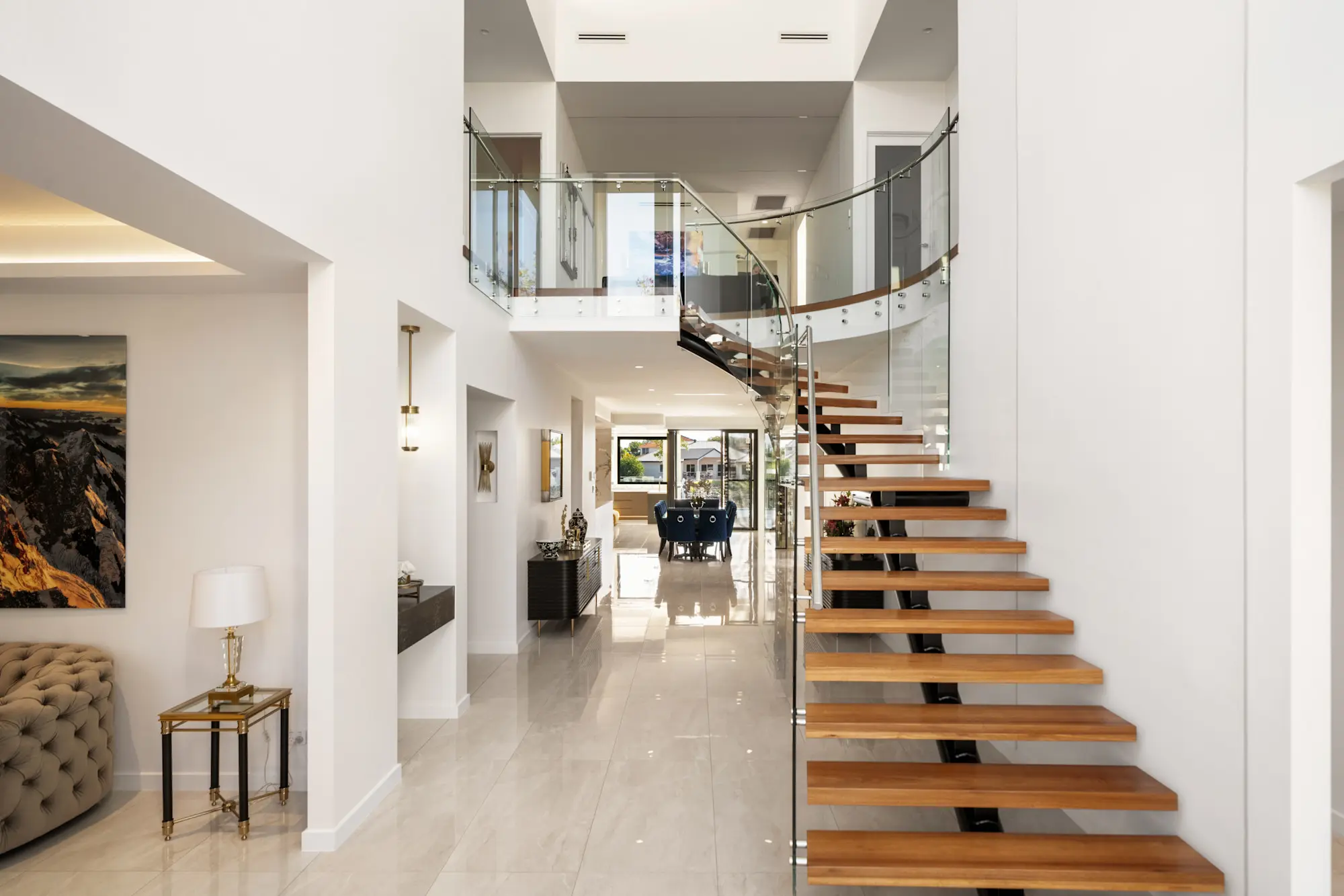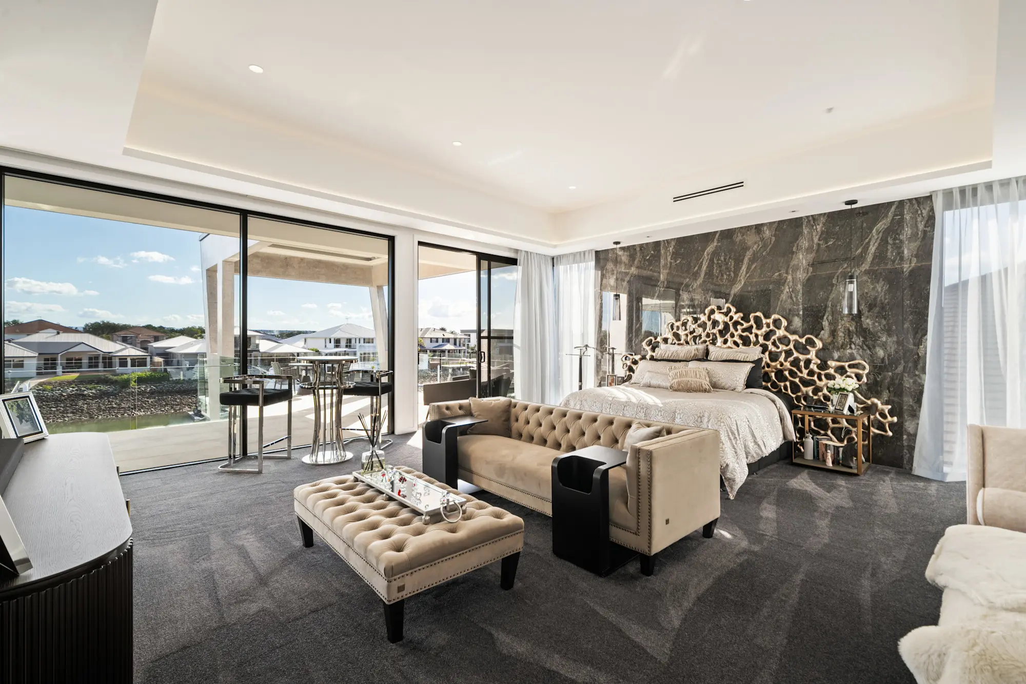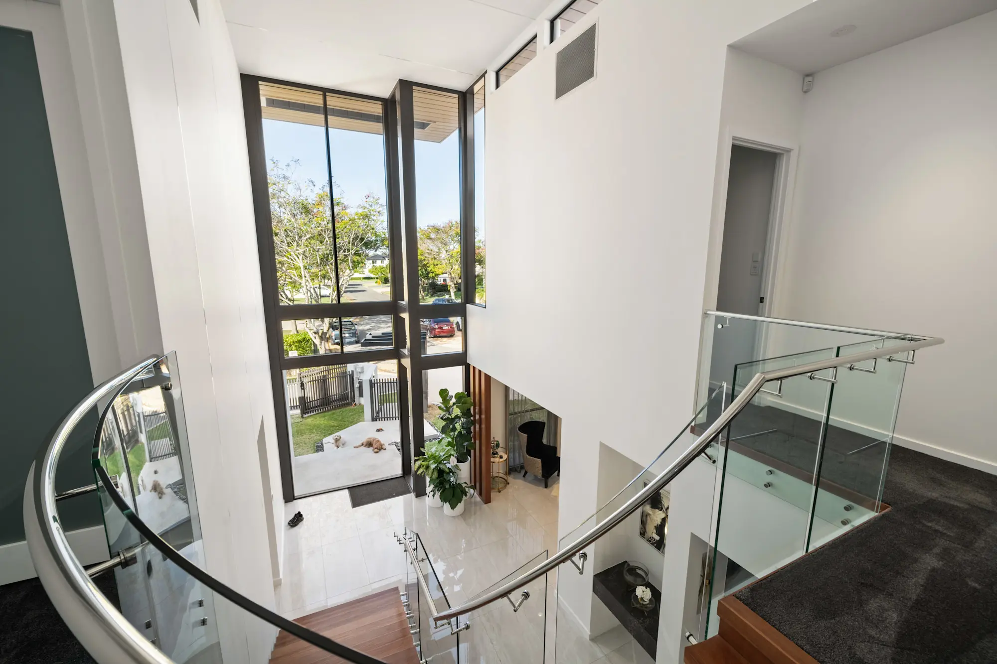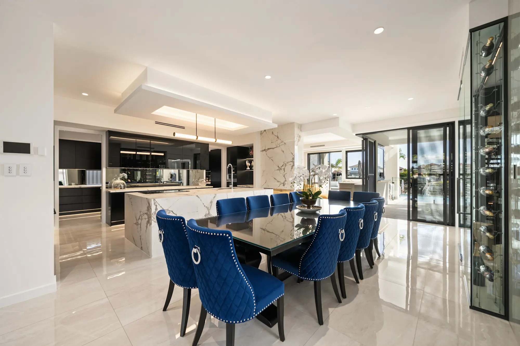 This stunning, high-end 1000-square-metre home has seven bedrooms and seven bathrooms and backs onto the picturesque waters of Newport Marina in the Moreton Bay region north of Brisbane. Its bespoke features include a three-tier cinema room, glass-roofed atrium, rooftop terrace, spiral staircase with curved glass balustrading, vast built-in cabinetry and storage, champagne cellar, above-ground pool and extensive outdoor entertaining.