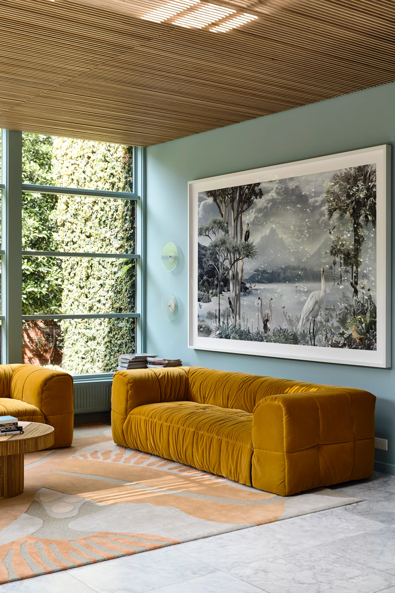 Yellow couches in light-filled room with windows floor to ceiling