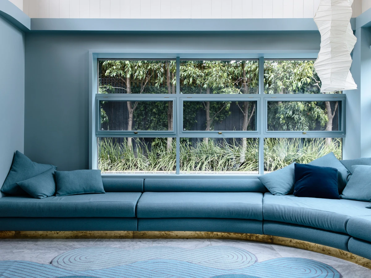 Colour Awards entry Erskine House with blue/green walls and built in sofa in matching colour, with large window behind it.